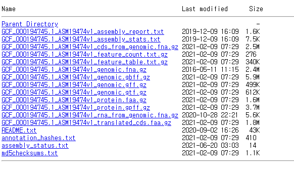 FTP에 들어가게 되면 [그림 2]와 같은 화면을 확인할 수 있으며, 우리는 그 중에서 rna_from_genomic.fna.gz 파일을 다운로드 받는다.