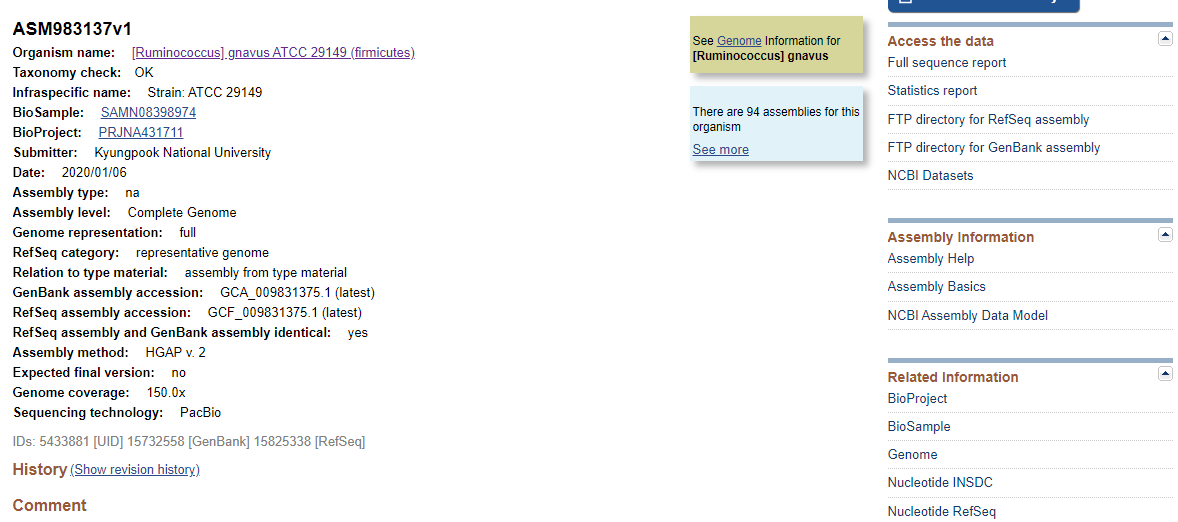[그림 1] 우측에 표시된 FTP directory for RefSeq assembly로 접속
