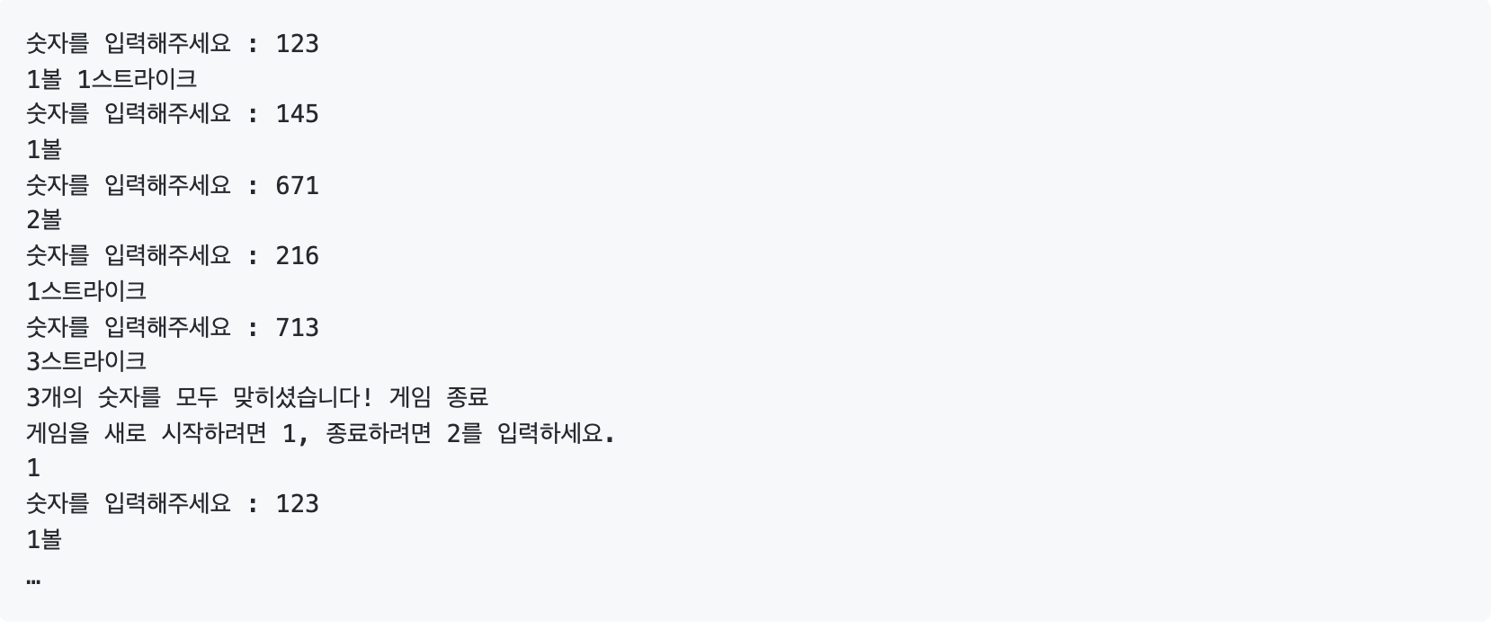 - 스트라이크와 볼의 개수를 저장한 후 출력.