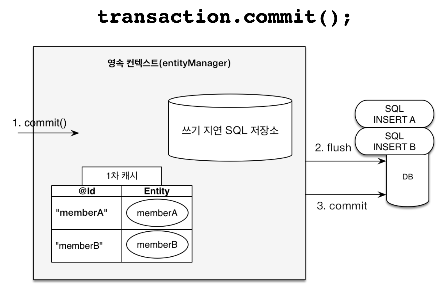 commit 하는 시점에 쓰기 지연 SQL 저장소에 저장되어 있는 query들을 날려버린다.
