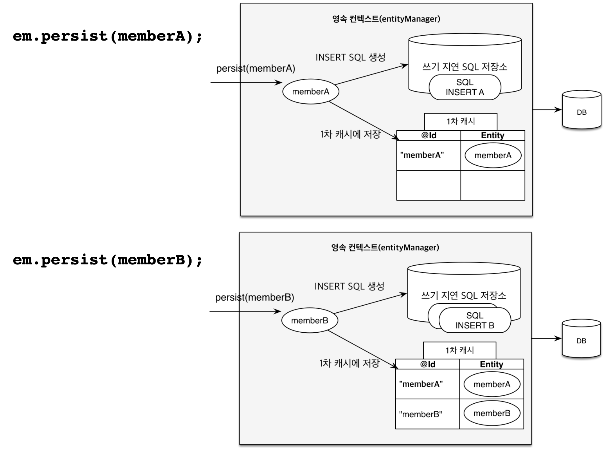 memberA와 memberB를 1차 캐시에 저장하는 persist 명령어를 사용하면, 쓰기 지연 SQL 저장소에 query문을 임시로 저장한다.