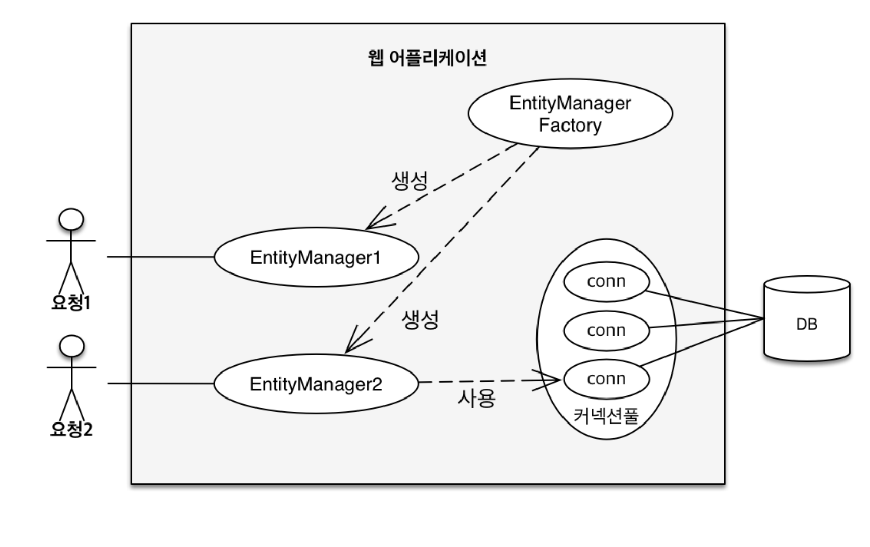 고객의 요청이 올 때마다 EntityManagerFactory를 이용하여 EntityManager를 생성하는데, EntityManager는 내부적으로 데이터 베이스 커넥션을 사용해서 db를 사용하게 된다.