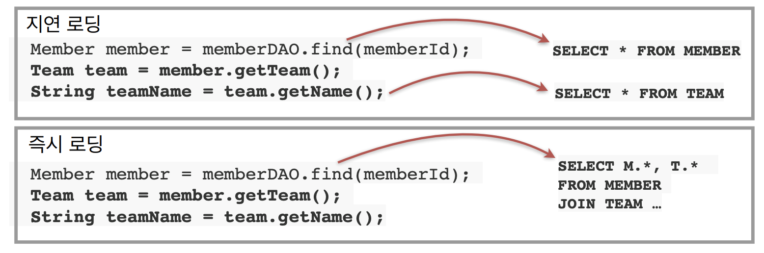 즉시 로딩: JOIN SQL로 한번에 연관된 객체까지 미리 조회 (멤버를 가져오는 순간 항상 팀을 같이 가져온다면, 조회 할 때 한번에 가져와 라고 조회를 하면 된다. 옵션 하나로 설정이 가능하다.)