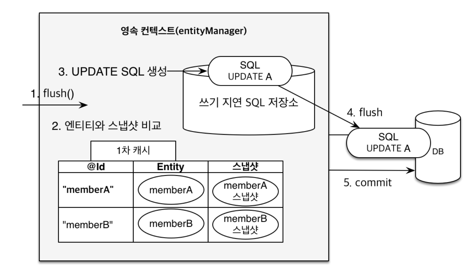 변경된 사항은 쓰기 지연 SQL 저장소에 저장이 되고, commit이 되기 전 내부적으로 flush가 호출이 되어 변경된 사항이 query로 발송이 된다.