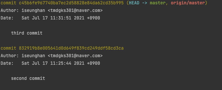 제일 마지막 줄에서 세번째를 보면 " commit: third commit " 이것이 바로 세번째 커밋임을 알 수 있습니다. (Commit id : c45b)