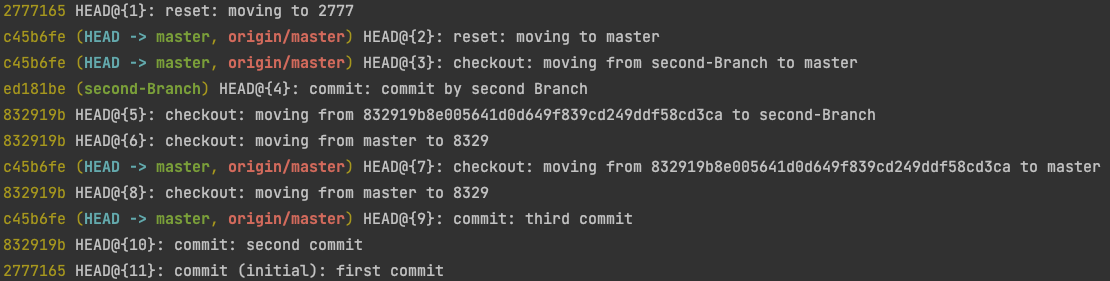 커밋 ID 옆에 보면 HEAD@{N} 라고 있는데 이 N이라는 숫자가 작을수록 최근에 HEAD가 가리켰던 Commit을 의미합니다.