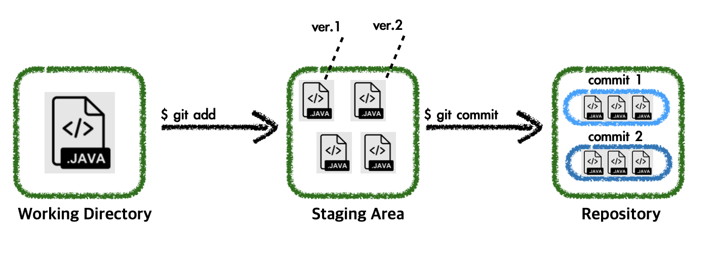 - Staging Area : 커밋을 하기 위해 $ git add 명령어로 추가한 파일들이 모여있는 공간