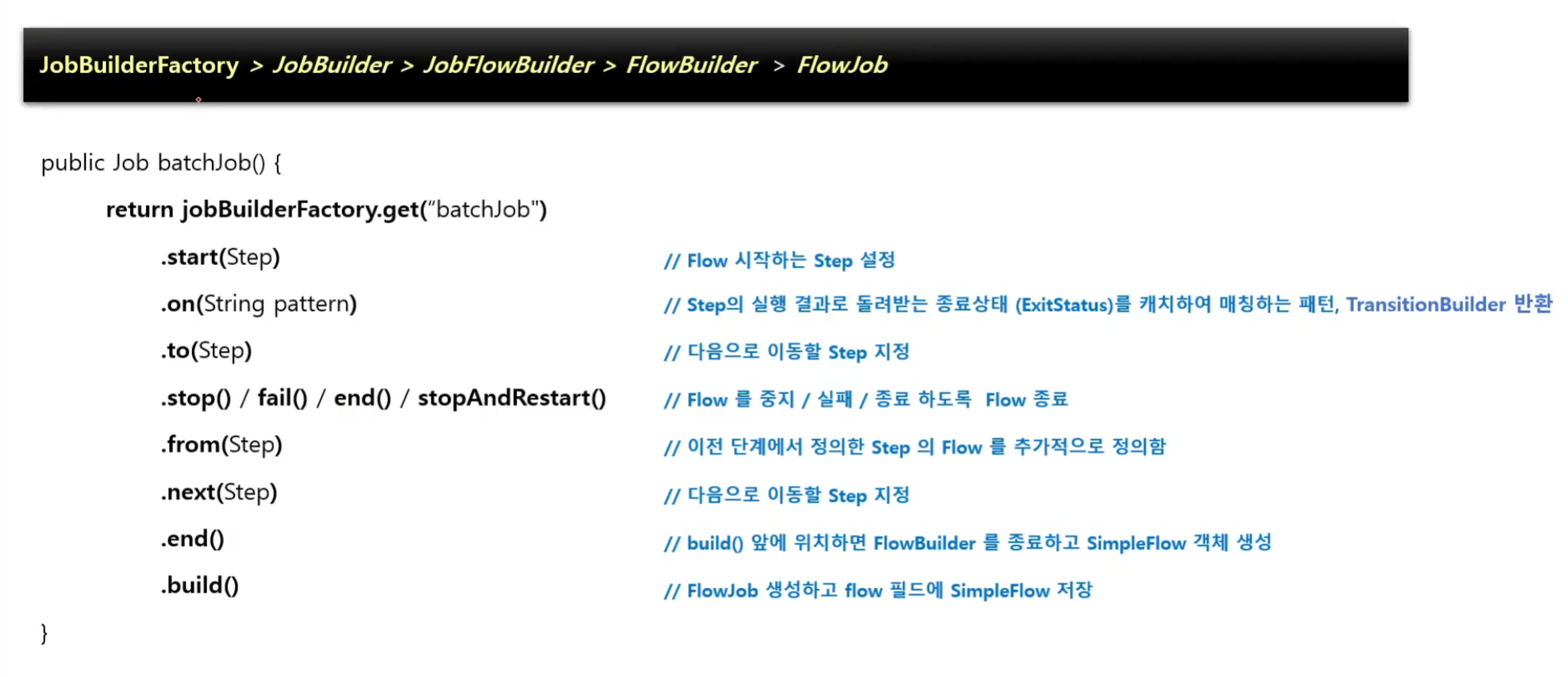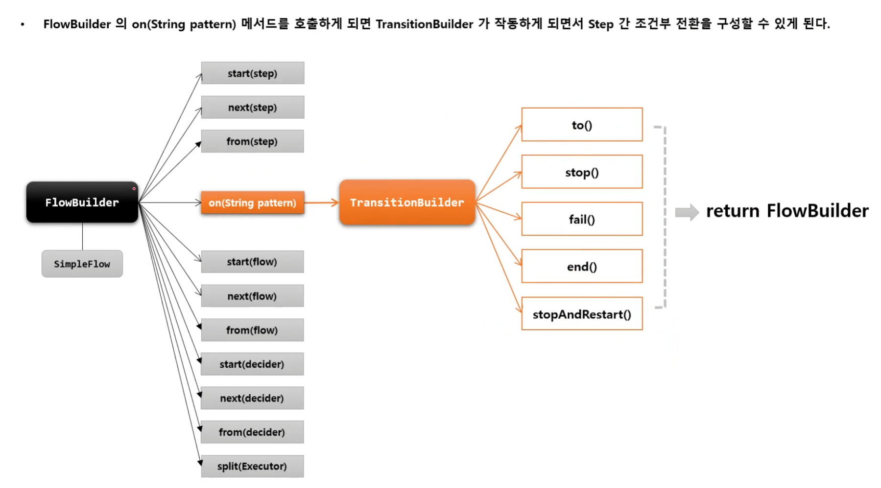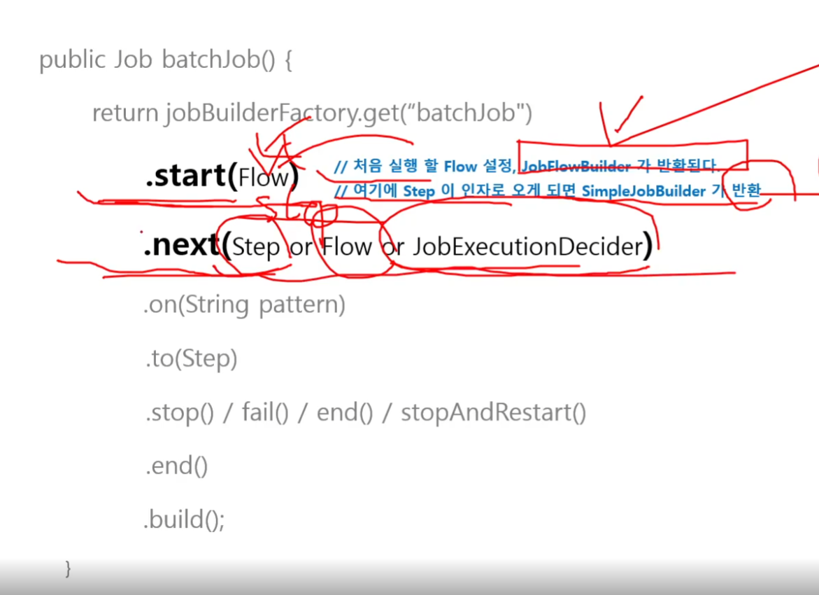 Transition: 조건에 따라 흐름을 전환시키는 역할을 하는 api (on(), to() , stop() / fail() / end() / stopAndRestart())