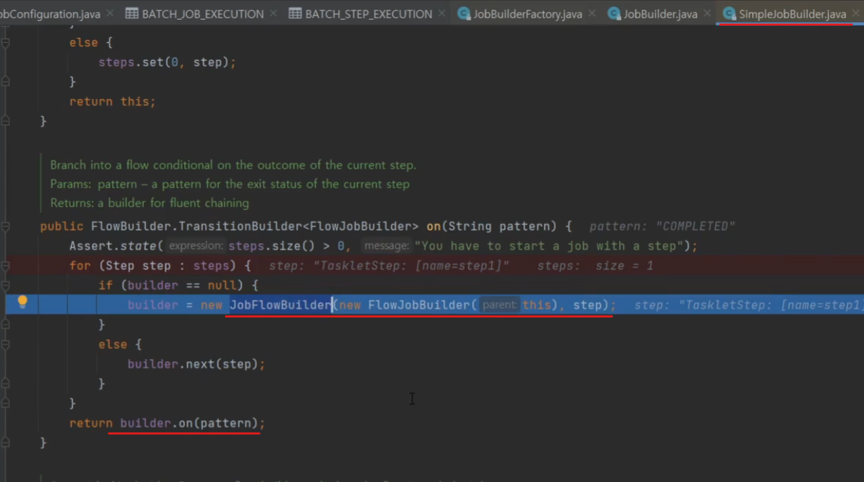SimpleJobBuilder에서 JobFlowBuilder를 생성하고 on 메서드를 실행