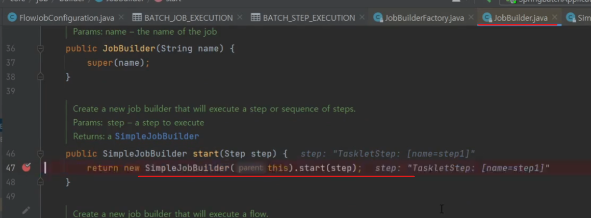 step을 넣으면 simpleJobBuilder가 반환되는데