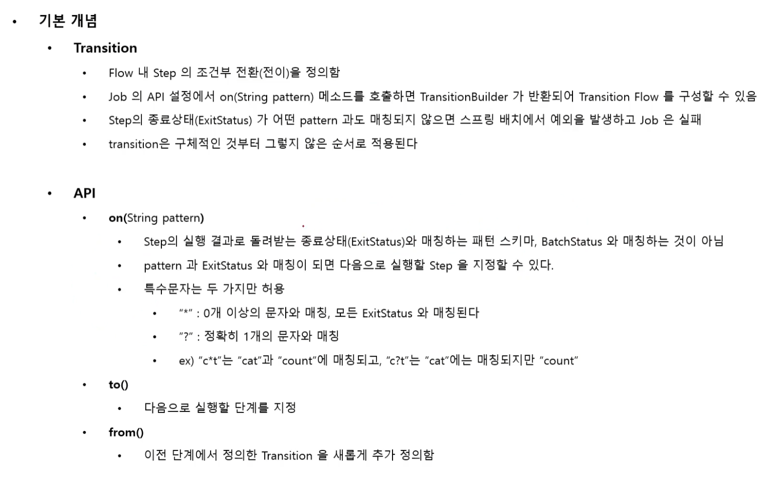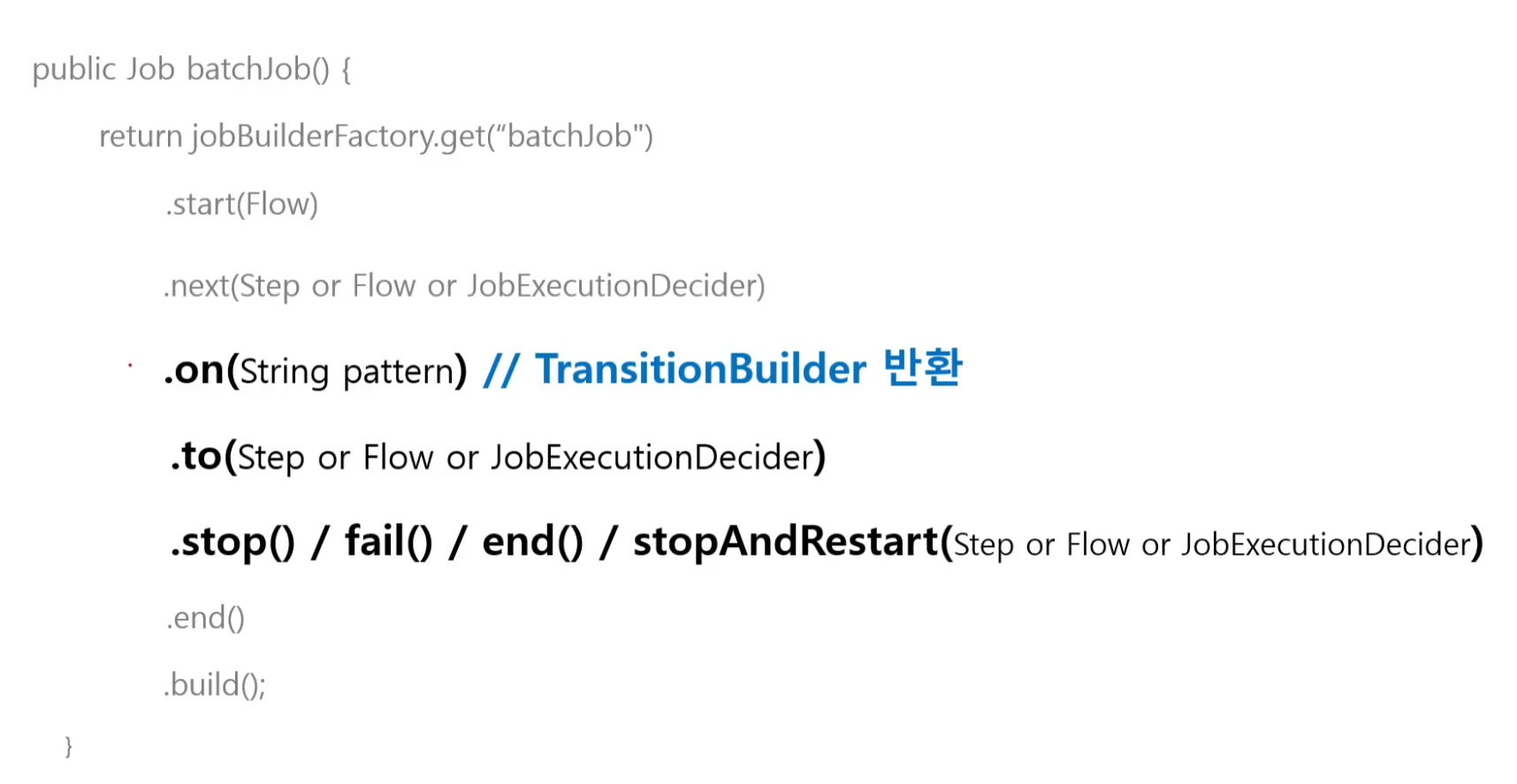 - Job의 API 설정에서 on(String pattern) 메소드를 호출하면 TransitionBuilder가 반환되어 Transition Flow를 구성할 수 있음
