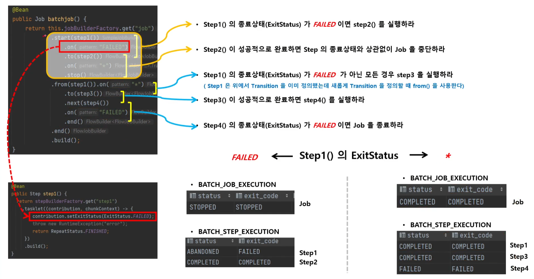 - Step의 종료상태(ExitStatus)가 어떤 pattern과도 매칭되지 않으면 스프링 배치에서 예외를 발생하고 Job은 실패