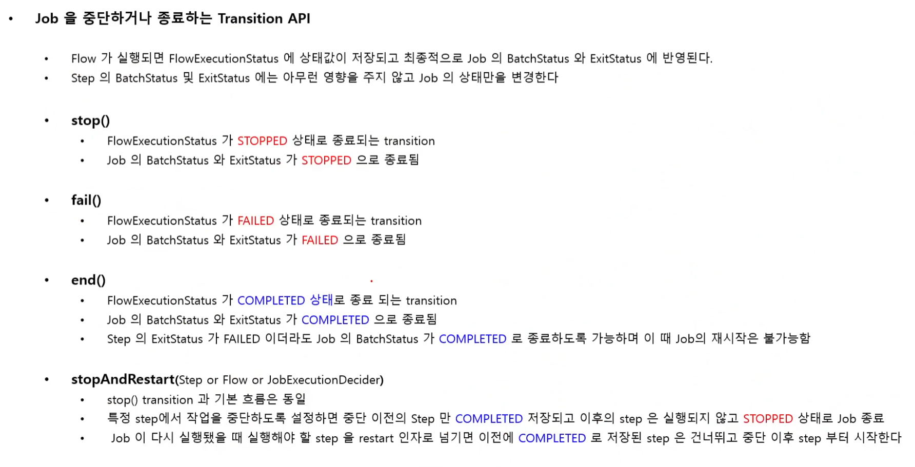 Transition: 조건에 따라 흐름을 전환시키는 역할을 하는 api (on(), to() , stop() / fail() / end() / stopAndRestart())