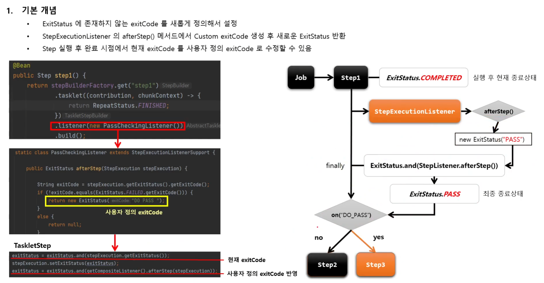 StepExecutionListener의 afterStep() 메서드에서 Custom exitCode를 생성 후 새로운 ExitStatus 반환 가능