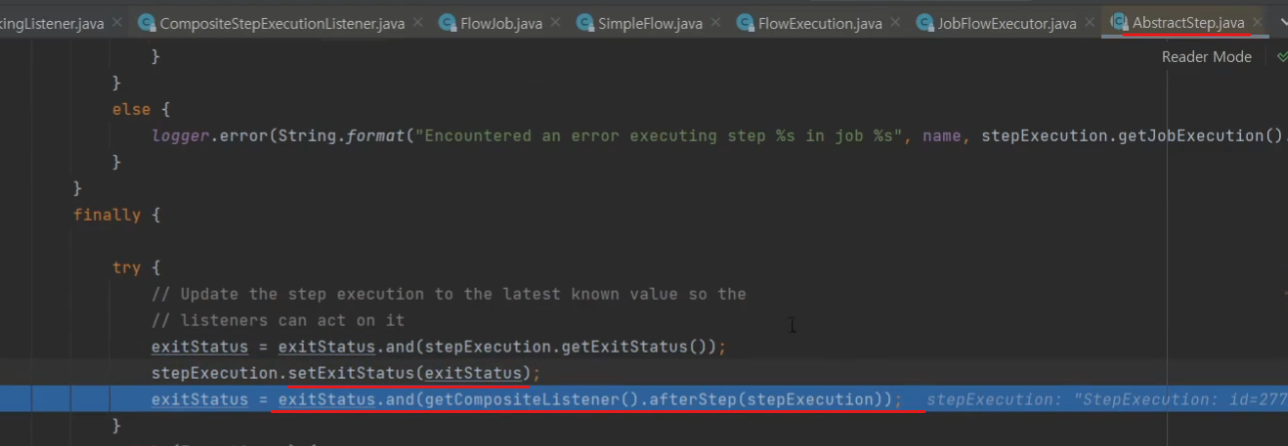 우리가 StepExecutionListener을 구현한 구현체가 호출이 된다