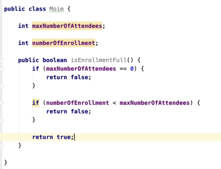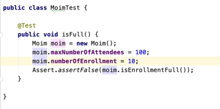 Moim이라는 클래스에는 isEnrommmentFull 이라는 메서드가 존재하는데,