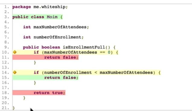 isEnrollmentFull() 확인하면 일부만 테스트가 된 부분은 노란색으로 표시가 된다.