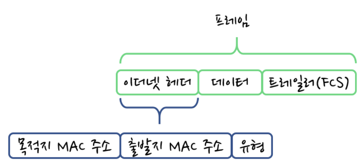 이더넷 헤더 (목적지의 MAC 주소 (6바이트), 출발지 MAC 주소(6바이트), 유형(2바이트) 총 14바이트로 구성