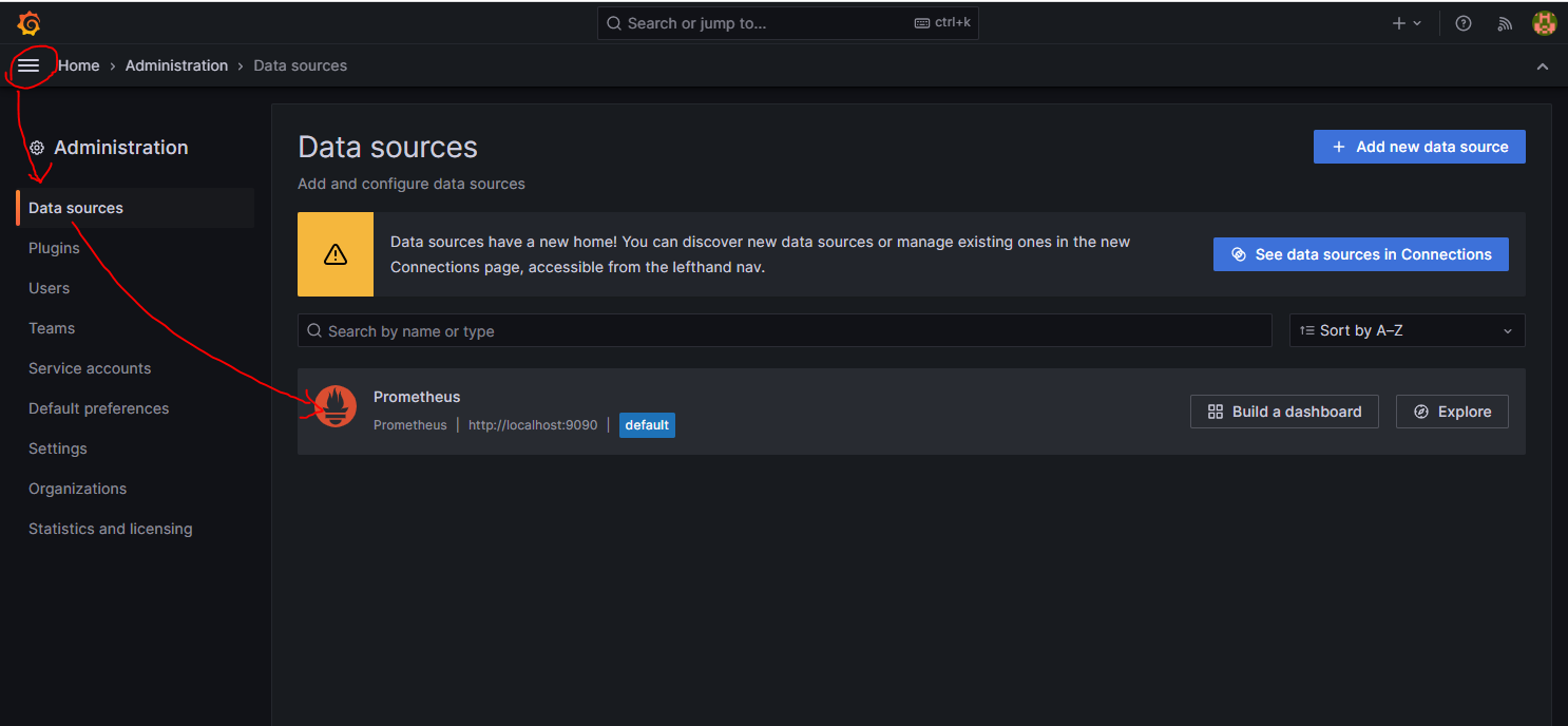 Datasource로 오게 되면 Prometheus 아이콘이 나타나 있는 것을 확인할 수 있다.