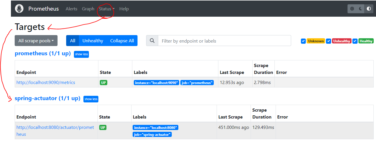 프로메테우스가 어플리케이션의 /actuator/prometheus 를 호출해서 메트릭을 주기적으로 수집하도록 설정