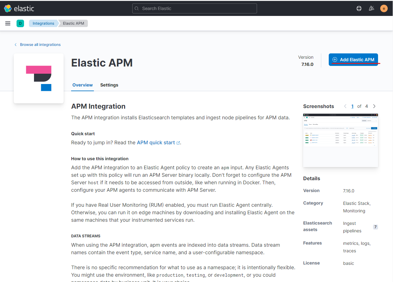 Add Elastic APM 버튼을 클릭합니다.