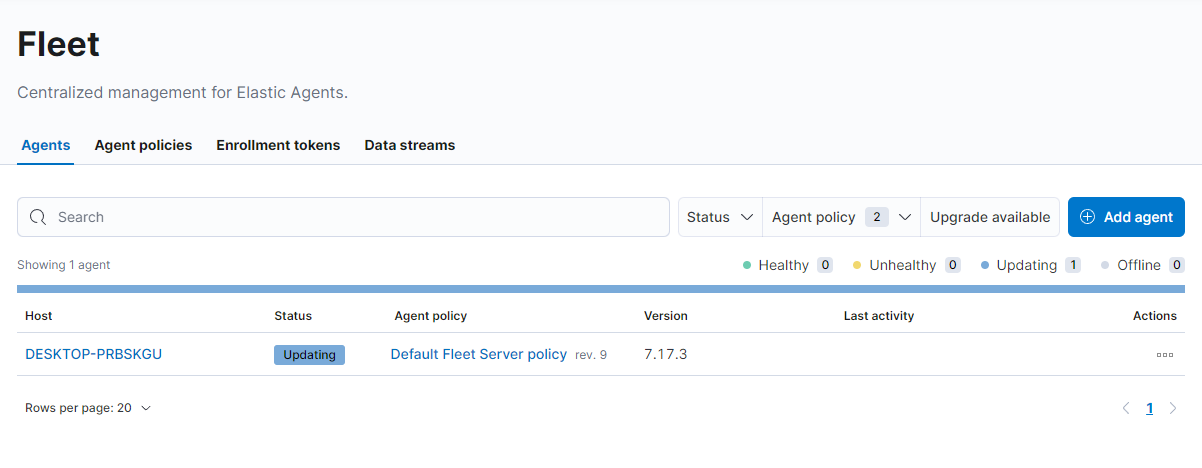 Kibana를 통해서 Fleet 페이지를 확인하면 Policy가 등록된 것을 확인할 수 있습니다.