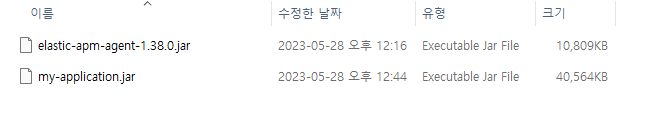 jar 파일을 실행합니다. elastic-apm-agent는 실행할 프로젝트를 입력해줘야합니다. 간단한 spring boot 프로젝트를 만들어서 같은 폴더에 위치시켜줬습니다. elastic-apm-agent를 아래와 같은 명령어를 실행하려면 폴더 구조는 다음과 같아야 할 것입니다.