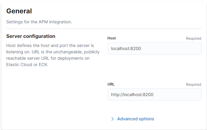 - APM server url : APM server가 이벤트를 수신 대기하는 호스트 및 포트입니다. 이는 APM integration을 설정할 때 정의된 호스트 및 포트와 일치해야 합니다.