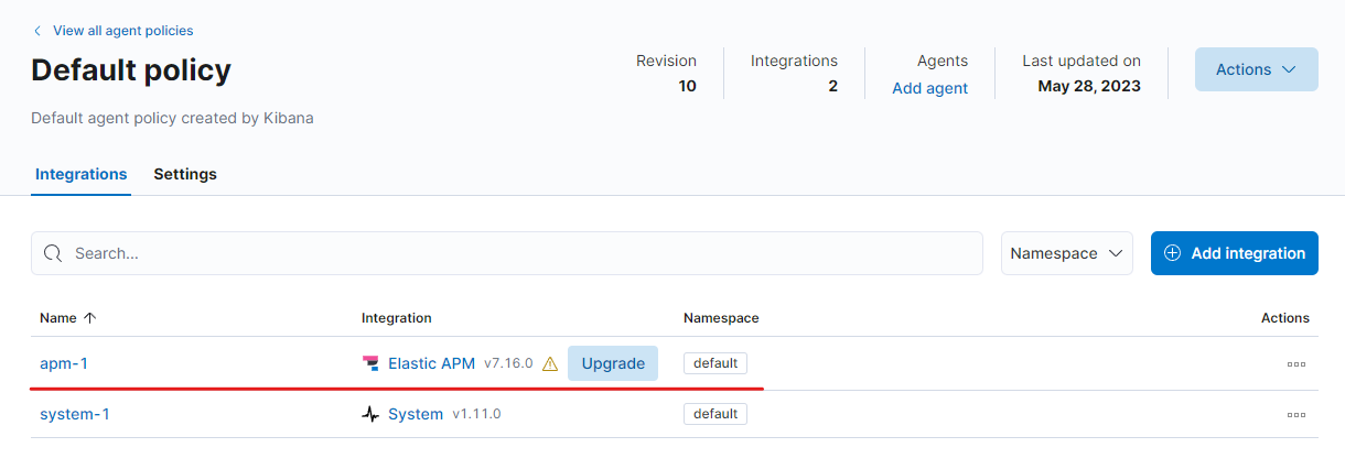 새로 업데이트한 policy를 확인하려면 Fleet > Agent policies > Default policy에 들어가면 확인할 수 있습니다. 제가 설정한 policy는 apm-1 이라는 이름으로 생성된 것을 확인할 수 있습니다.
