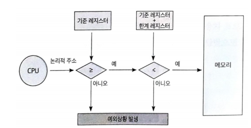 사용자 프로그램은 기준 레지스터 + 한계 레지스터값 사이의 주소 영역에만 접근할 수 있음