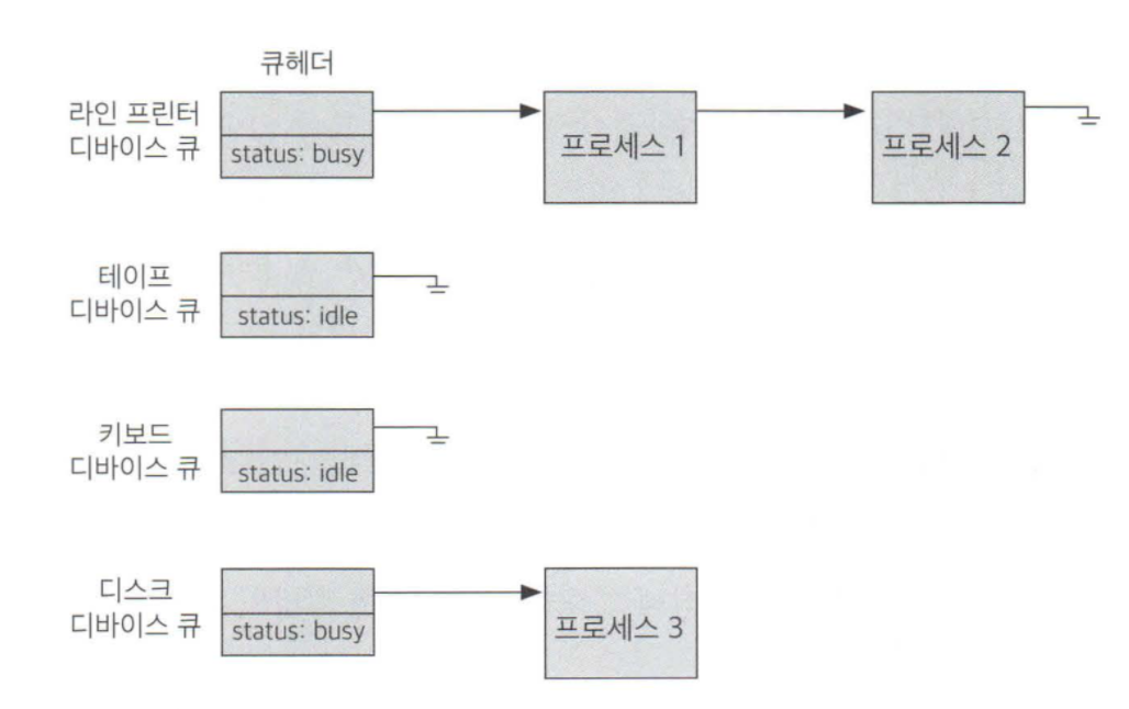 장치마다 큐헤더가 존재하고 장치별로 입출력 수행 순서를 지키기 위한 큐를 관리