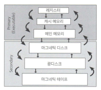 Primary에 존재하는 메모리는 휘발성이며, Secondary에 존재하는 디스크 및 테이프는 비 휘발성이다.