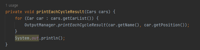 playGame 메서드에서 흐름이 시작되는데 이 메서드에서는 확인해보면 사이클마다 자동차가 이동을하고 (goEachcar), 각각의 사이클의 결과를 출력하고 (printEachCycleResult), 최종 결과를 출력하는 로직이 존재합니다.