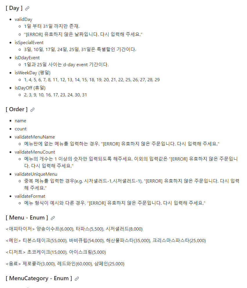 프로젝트 시작 전 기능 구현 목록을 정리하는 시간을 매번 가지고 있었는데, 절차 지향적으로 기능을 생각하다 보니 TDD가 더욱 어렵게 느껴졌던 것으로 판단하여 이번에는 가장 작은 단위의 클래스는 어떤 것이 있는지, 그 클래스에는 어떤 기능이 있어야 하는지, 객체 단위로 설계를 해보는 시간을 가졌다.